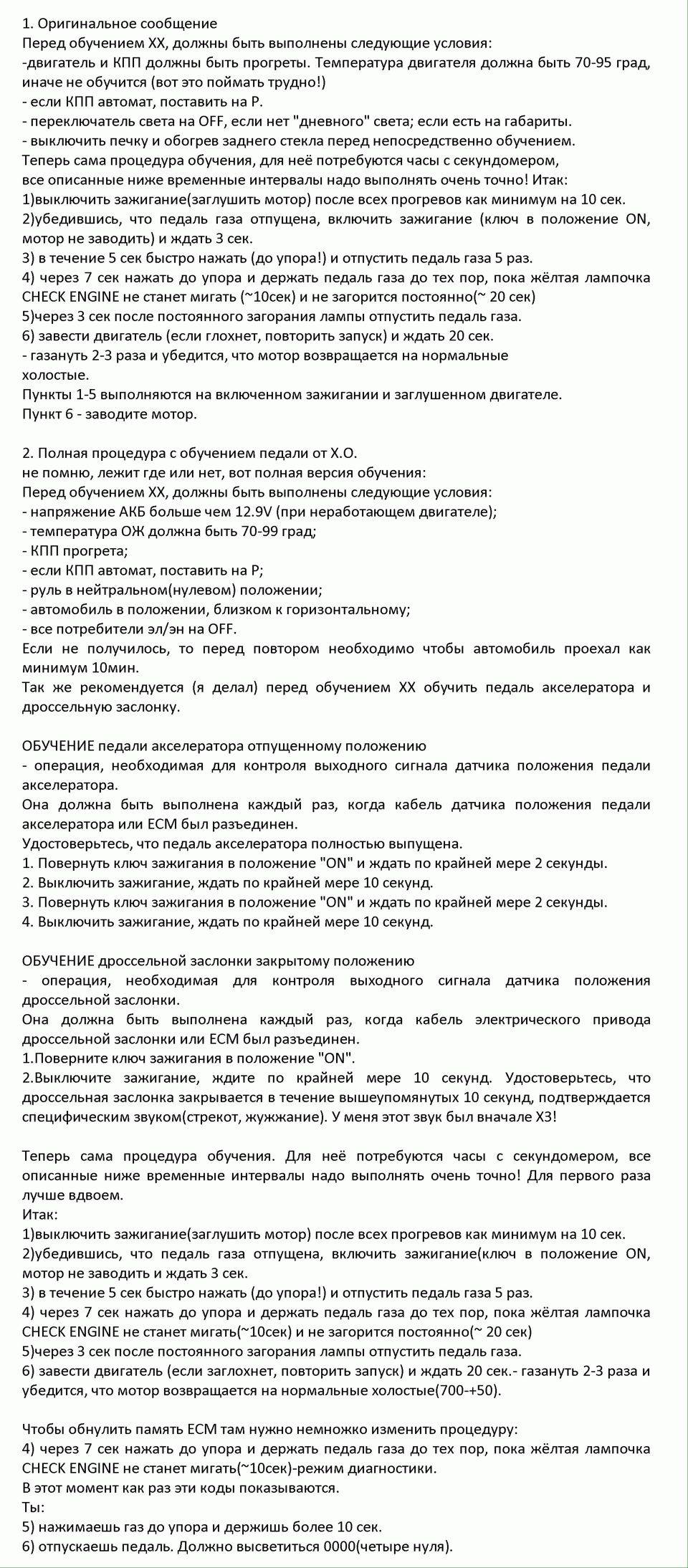 Теперь сама процедура обучения. Для неё потребуются часы с секундомером, все описанные ниже временные интервалы надо выполнять очень точно! Для первого раза лучше вдвоем.Итак:1)выключить зажигание(заглушить мотор) после всех прогревов как минимум на 10 сек.2)убедившись, что педаль газа отпущена, включить зажигание(ключ в положение ON, мотор не заводить и ждать 3 сек.3) в течение 5 сек быстро нажать (до упора!) и отпустить педаль газа 5 раз.4) через 7 сек нажать до упора и держать педаль газа до тех пор, пока жёлтая лампочка CНЕСK ENGINE не станет мигать(