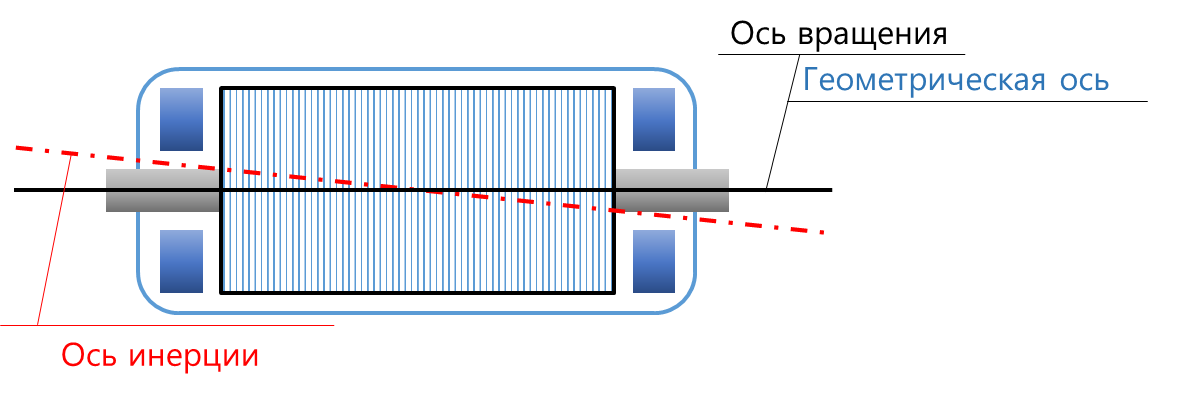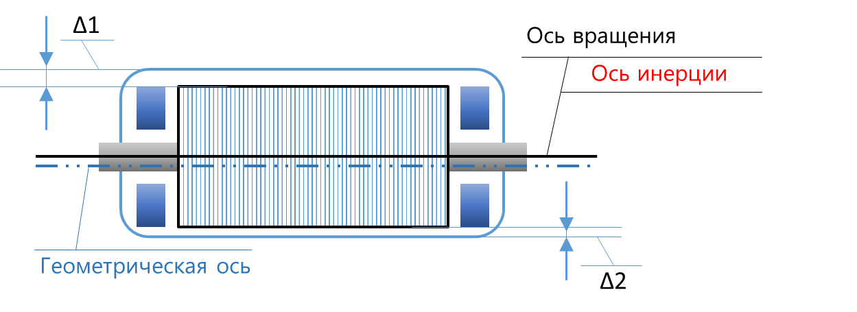 Смещение оси инерции относительно оси вращения приводит к появлению во вращающемся роторе центробежных сил с частотой вращения, действующих на ротор, которые уменьшают путем балансировки ротора с установкой (снятием) балансировочных масс в плоскости коррекции ротора. Результатом балансировки является снижение величины смещения этих осей друг относительно друга, которое в пределе стремится к нулю.