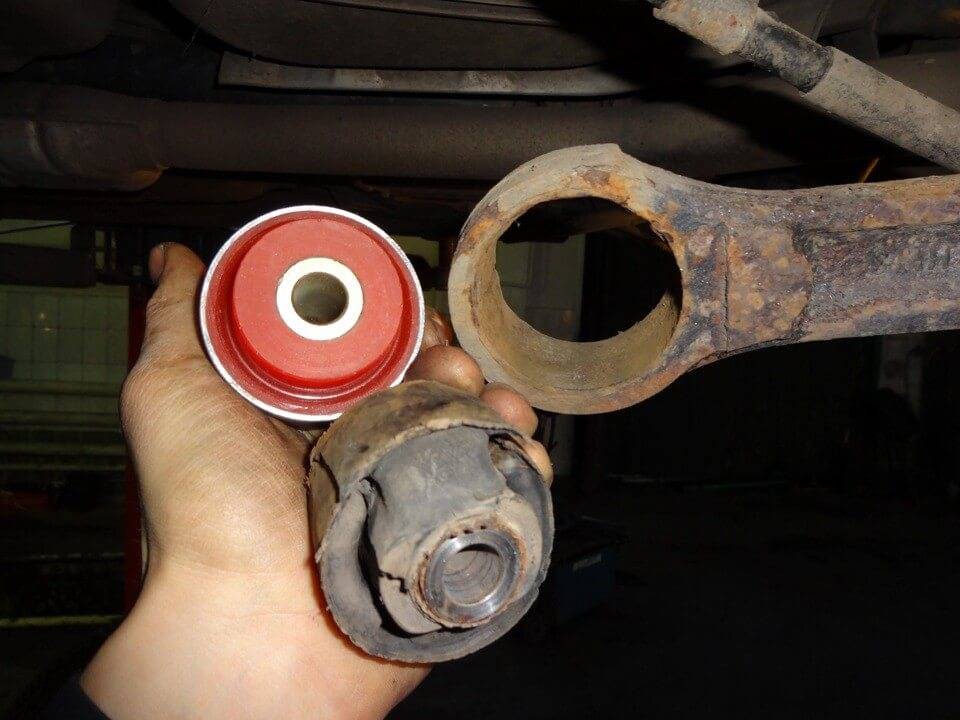 Также стук в заднем правом колесе при движении может случиться из-за разбитой втулки амортизатора. Чтобы это проверить, достаточно пошатать элемент в стороны. Амортизатор должен быть надежно закреплен в верхней и в нижней части. На таких автомобилях, как «Дэу-Нексия», задний амортизатор вверху крепится к кузову через резиновую шайбу. Если она хоть немного повреждена, могут издаваться очень сильные стуки на кочках. Сперва владелец подумает, что пора менять амортизатор. Но после его замены проблема не уходит. Поэтому не всегда нужно приговаривать сразу данный элемент. Нужно сперва проверить состояние всех резиновых элементов, что учувствуют в креплении амортизатора.