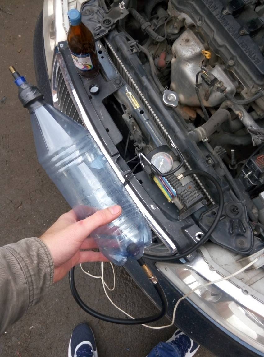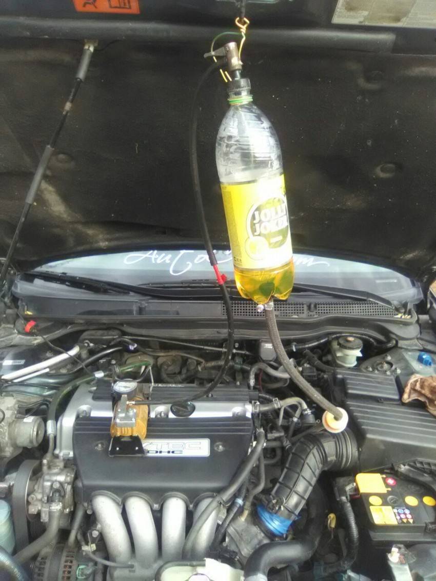 Отключаем от питания топливный насос, а обратку в бак нужно тоже отключить. Берем собранное устройство и подключаем к форсункам. На второй ниппель необходимо подключить компрессор дабы создать давление в бутылке, около 3 атмосфер.
