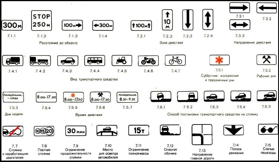 | Таблички дополнительной информации | Уточняют предписания знаков – на какие ТС и по каким дням недели действует предписание, где начало и конец действия знака, как далеко до какого-то объекта и пр. | Белая табличка с черным рисунком или надписью | “Направление главной дороги”, “Конец зоны действия знака”, “Платные услуги”, “Инвалид”. |