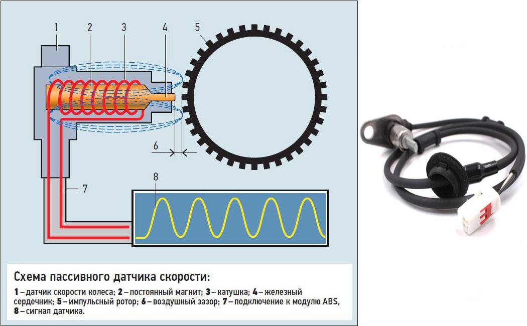 Датчики работают по принципу магнитной индукции и прикреплены неподвижно к ступице каждого колеса, а в некоторых АБС, к редуктору заднего моста автомобиля. Они представляют собой магнитную катушку. В каждой ступице находится зубчатый венец. При вращении колес, в катушке создается ток, величина его зависит от скорости вращения. Полученные данные передаются в блок управления.