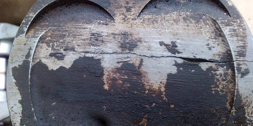 Наличие в поршне трещин определяется на слух. Для этого деталь берут за головку, а по юбке наносят легкие удары металлическим предметом. Глухой и дребезжащий звук – признак присутствия трещин.
