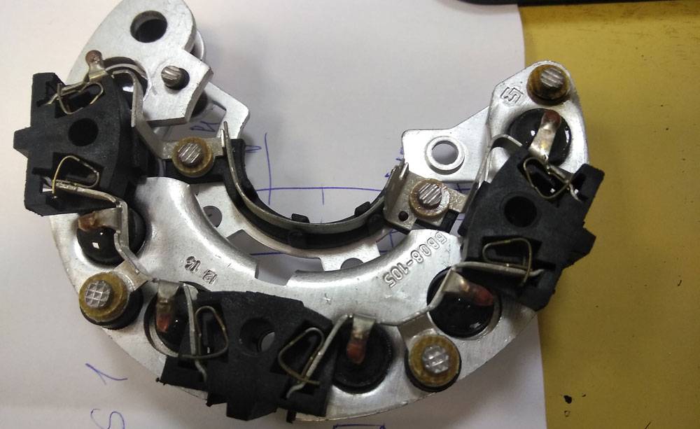 - генератора – из строя выходят 1 и 2 диод выпрямительного моста. пробой образуется из-за того, что через соединение проходит максимальный ток и он возрастает, поскольку сопротивление диодов нулевое. В результате растёт вероятность воспламенения проводки и повреждения других элементов бортовой сети.