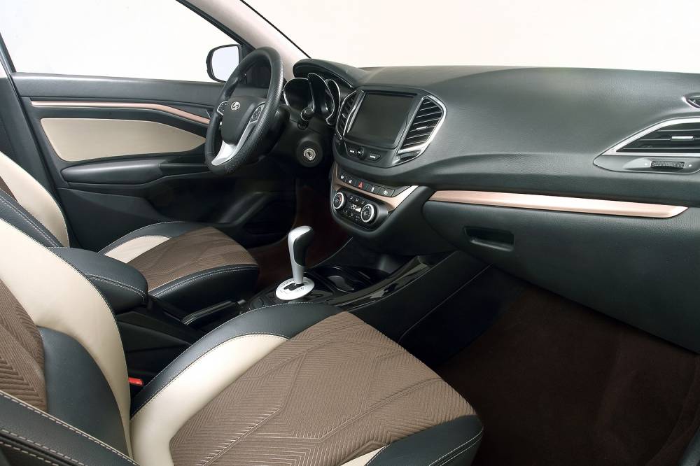 Интерьер Весты достаточно богат: при разработке модели использовался прочный и мягкий пластик (софтлук). Было выполнено комбинирование специальной автомобильной ткани и кожи черного/коричневого цветов для сидений. Появились матовые серебристые вставки для акцентирования стилистики. Приборная панель авто получилась привлекательной за счет использования двух тонов подсветки: белого и зеленого. На панели располагаются крупные показатели: тахометр, спидометр и датчик уровня топлива, совмещенный с температурным датчиком двигателя.