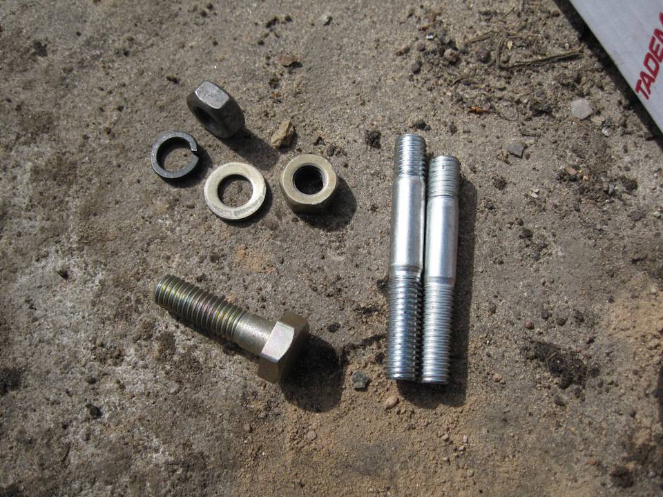 Шпильку М8х35 (и ещё +две других размеров) купил в Би-Би. Но лучше брать эту шпильку или эту. Обязательно шайбу «гровер» М8 и гайка М8 (на 13 или 14). Вот такой набор получился (на фото две не подошедшие шпильки).