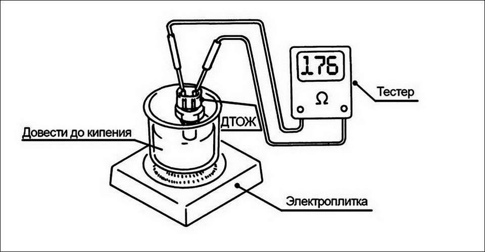 Если у вас нет термометра, способного измерить высокую температуру, можно обойтись и без него. Так как вода не может нагреваться выше 100 градусов, доводим ее до точки кипения, после чего меряем датчиком сопротивление. Оно должно достигать 177 Ом.