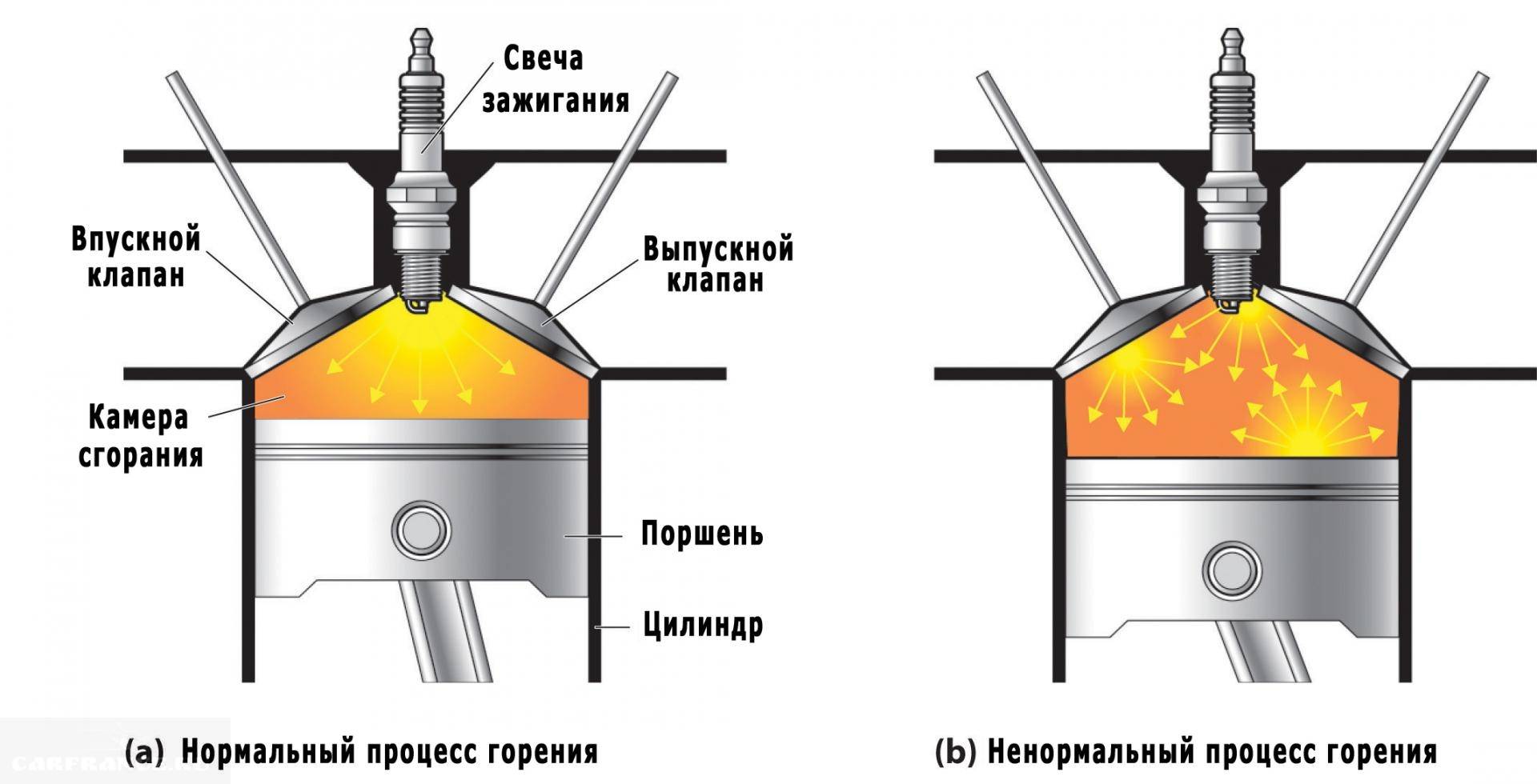 Если в нормальном режиме воздушно-топливная смесь может сгорать и распространять фронт пламени со скоростью от 25 до 30 м/с , то во время детонационного процесса фронт распространяется со скоростью в 10–15 раз быстрее. А это уже больше похоже на разрушительный взрыв. Тем не менее детонацию часто путают с калильным зажиганием.