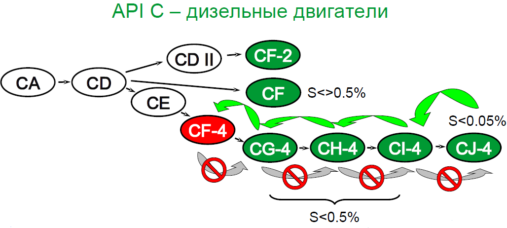 - CI-4 – для автомобилей 2002 года выпуска и старше. Удовлетворяет требованиям 2004 года к содержанию вредных веществ в выхлопных газах.