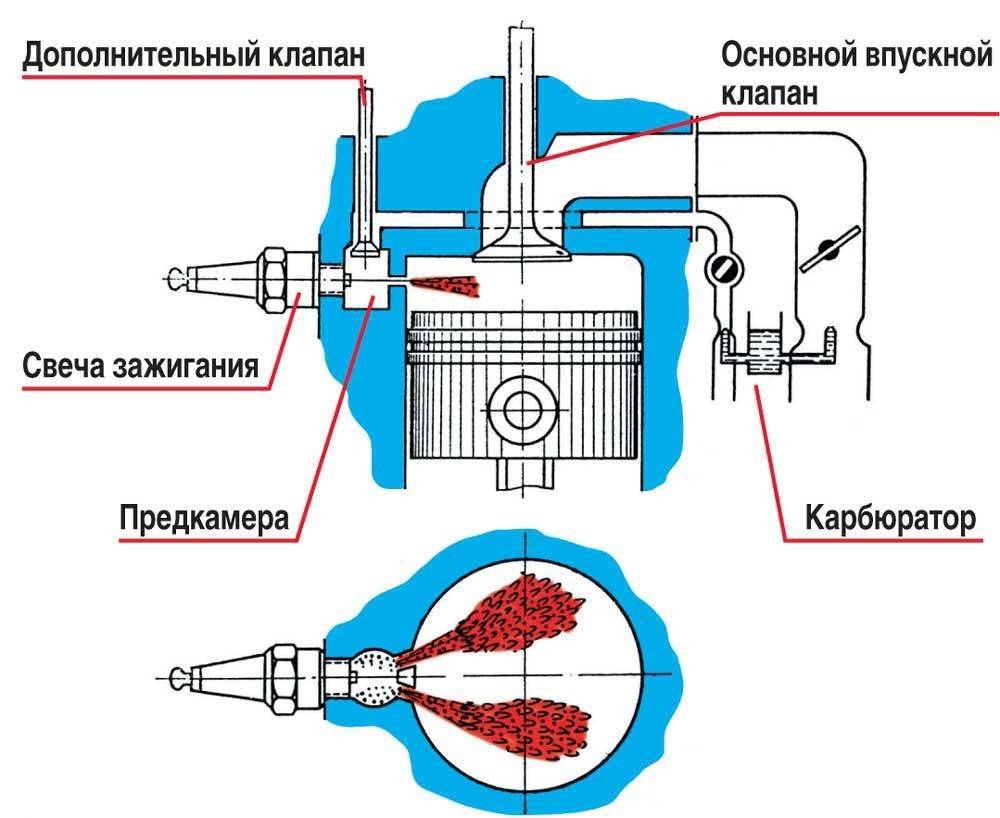 Как мы уже описали выше, форкамерный двигатель имеет следующий принцип действия в работе: