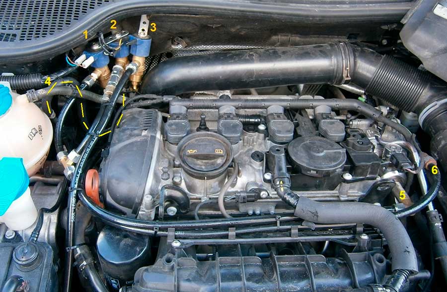 Как и раньше, из баллона газ, но уже под высоким давлением, посредством магистралей подается в подкапотное пространство.
