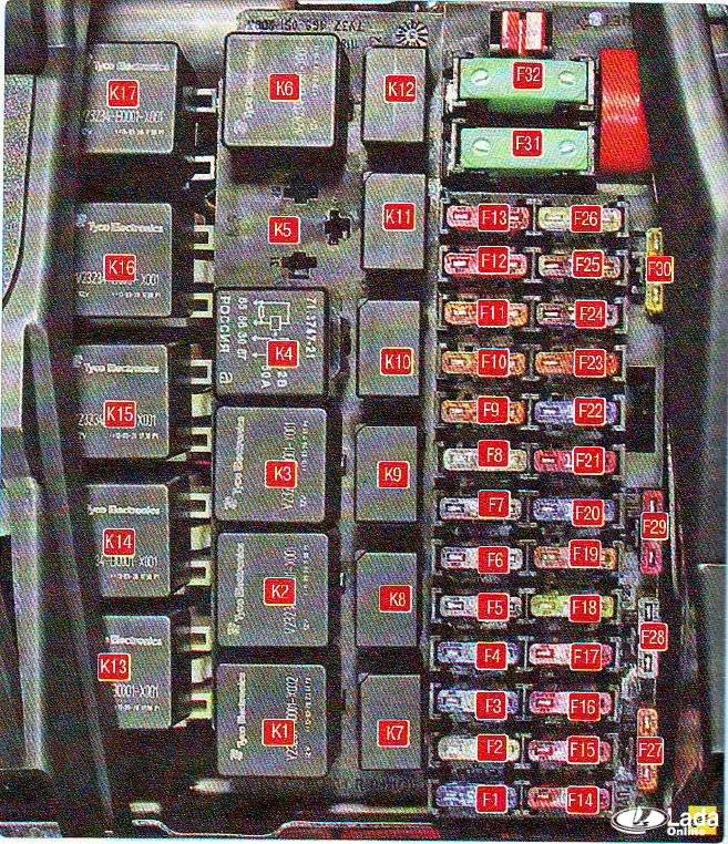 F1(10) – Иммобилайзер, световые сигнализаторы и стрелочные указатели комбинации приборов, цепи выключателя и лампы света заднего хода, цепи указателей поворотовF2 (30) – Цепи электростеклоподъемниковF3 (10) – Цепи аварийной сигнализацииF4 (20) – Очиститель ветрового стекла, цепь выключателя обогрева заднего стеклаF5 (25) – Электродвигатель отопителя, блок управления электроусилителем руля, омыватель ветрового стеклаF6 (20) – Звуковой сигналF7 (10) – Жидкокристаллический индикатор комбинации приборов, выключатель и лампы сигналов торможения, освещение салонаF8 (20) – Элемент обогрева заднего стеклаF9 (5) – Лампы габаритного света в правой блок-фаре и правом фонаре, лампа освещения вещевого ящикаF10 (5) – Лампы габаритного света в левой блок-фаре и левом фонаре, сигнализатор наружного освещения в комбинации приборов, лампы освещения номерного знакаF11 (7,5) – Цепи ламп противотуманного света в задних фонаряхF12 (7,5) – Лампа ближнего света (правая блок-фара), мотор-редуктор корректора света правой блок-фарыF13 (7,5) – Лампа ближнего света (левая блок-фара), мотор-редуктор корректора света левой блок-фарыF14 (10) – Лампа дальнего света (правая блок-фара), сигнализатор дальнего света фар в комбинации приборовF15 (10) – Лампа дальнего света (левая блок-фара)F16, 17 (10) – Лампы противотуманных фар (опция)F18 (15) – Элементы подогрева сидений (опция)F19 (10) – Электрические цепи АБС (опция)F20 (15) – Нагревательный элемент прикуривателяF21(10) – Цепь блокировки заднего хода коробки передачF22 (15) – Блок управления охранной сигнализациейF23 – РезервF24 – РезервF25 – РезервF26 (25) – Электрические цепи АБС (опция)F27 (5) – ЗапаснойF28 (7,5) – ЗапаснойF29 (10) – ЗапаснойF30 (20) – ЗапаснойF31(50) – Электроусилитель руля