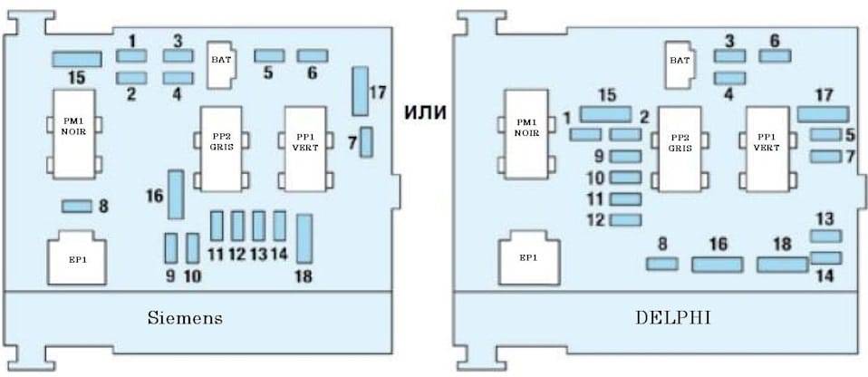 | 18 | 10А Диагностический разъем, подрулевые переключатели, выключатель стоп-сигнала и датчик сцепления, датчик уровня охлаждающей жидкости, 2-й датчик тормозной системы. |