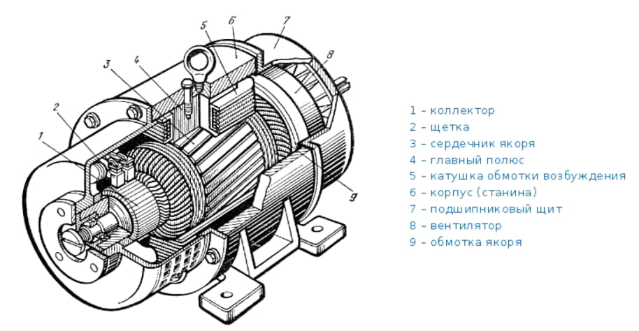 - ротор с полюсами из мягкого электротехнического железа, медными обмотками и коллектором;