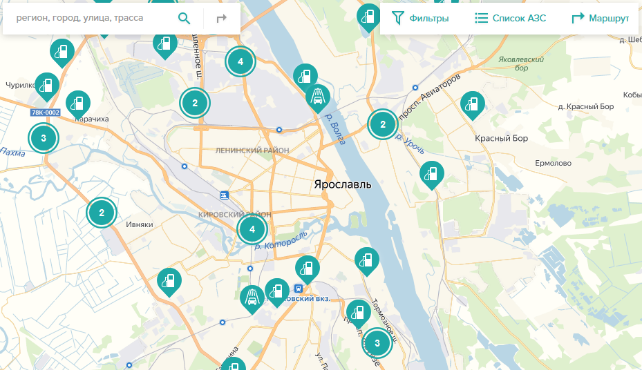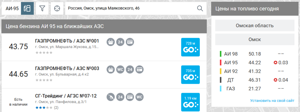 Удобный сервис для просмотра средних цен на топливо. Можно задать регион поиска, конкретную марку топлива и компанию-продавца. Как и предыдущий сервис, позволяет просматривать информацию об отдельных АЗС. Для некоторых заправок доступны отзывы клиентов.