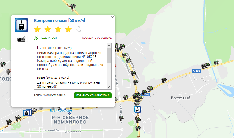 Для каждого объекта указано не только местоположение, но и вид отслеживаемого нарушения. Некоторые водители с удивлением узнают, что знакомая камера над проспектом контролирует вовсе не скорость, а проезд по автобусной полосе.