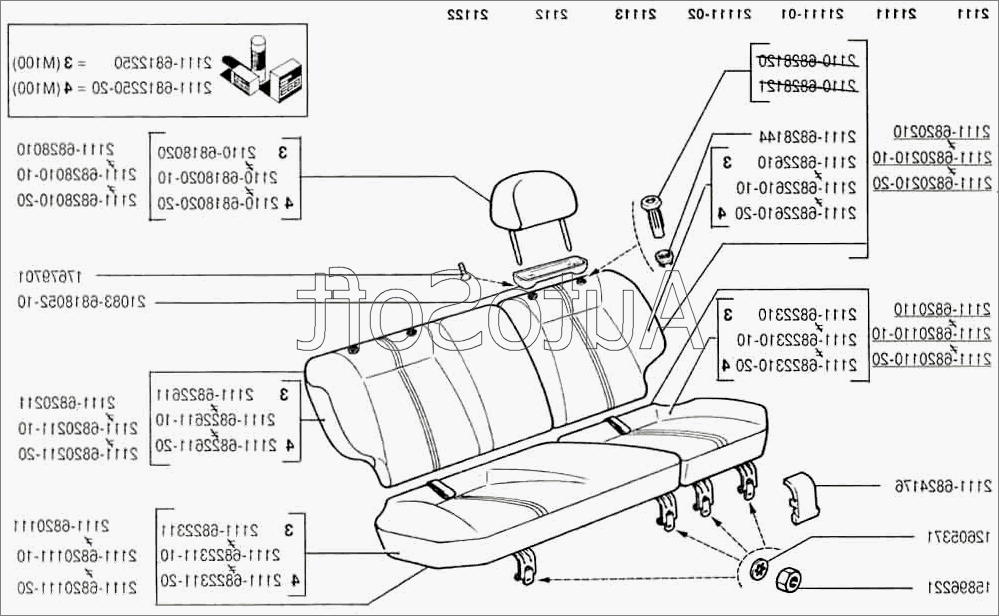 - для задних сидений — 1 нижняя часть и 1 верхняя часть, но если сиденье состоит из двух частей, то должны быть получены 2 нижние части и 2 верхние части;