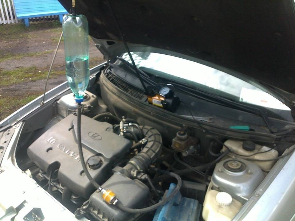 Подвешиваем бутылку вниз пробкой и запускаем автомобиль.