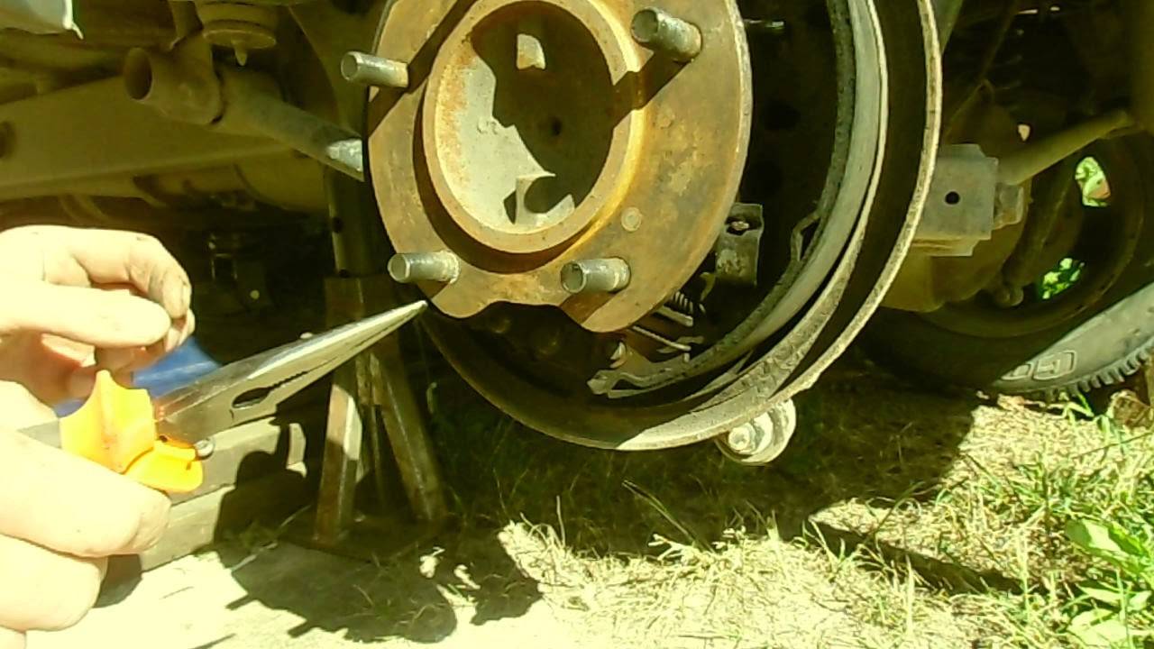 - Теперь можно вытаскивать колодки, предварительно отключив от верхней крючок, приводящий стояночный тормоз с колесами;