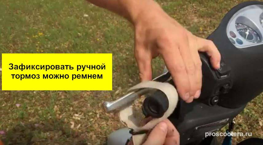 При наличии ржавчины у вас возникнут проблемы при откручивании. Поэтому применение этого спрея значительно облегчит процедуру, так как все болты и гайки будет просто открутить. От прокручивания колеса при демонтаже прижмите тормозные колодки с помощью фиксации ручки тормоза обычным ремнем, как на фото: