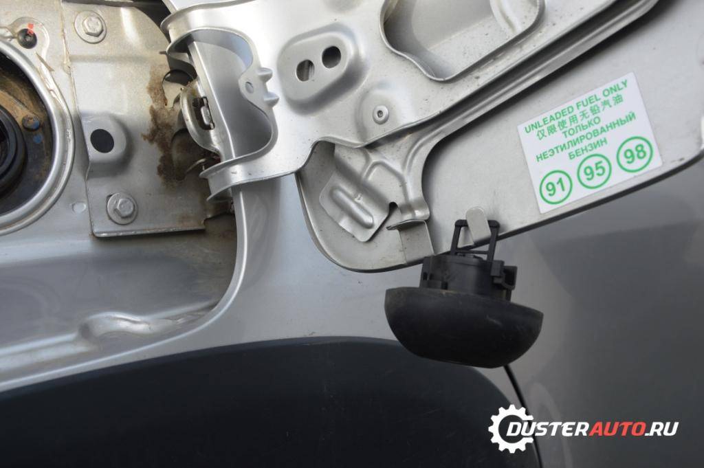 Заехав первый раз на заправку на своем новом Рено Дастере, я не сразу сообразил куда можно приспособить крышку от бензобака, когда вставляешь пистолет бензоколонки. Пришлось положить крышку в карман и пойти расплачиваться с кассиром за бензин. И только потом мы догадались, что на люке бензобака есть специальный крючок, на который вешается крышка бензобака, вот так: