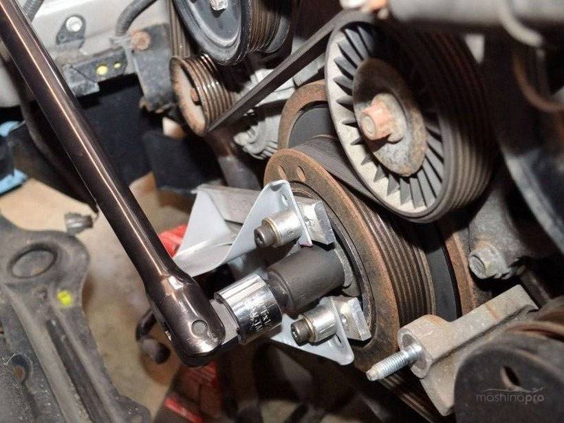 - накинуть головку ключа на гайку и упереть конец рычага в землю или лонжерон так, чтобы шкив не мог провернуться вправо;