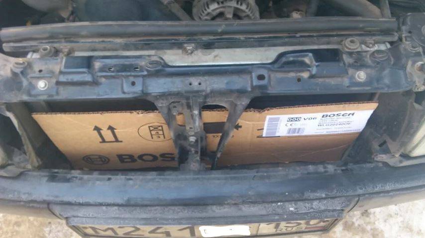 - Самый популярный среди отечественных автолюбителей способ сократить время прогрева при холодном пуске – это заглушить радиаторную решетку картонкой или другим плотным материалом. Сложно сказать, насколько это может быть эффективно, но на наш взгляд, лучшего средства, чтобы закипятить двигатель, просто не найти. Особенно, если вы попадете в пробку.