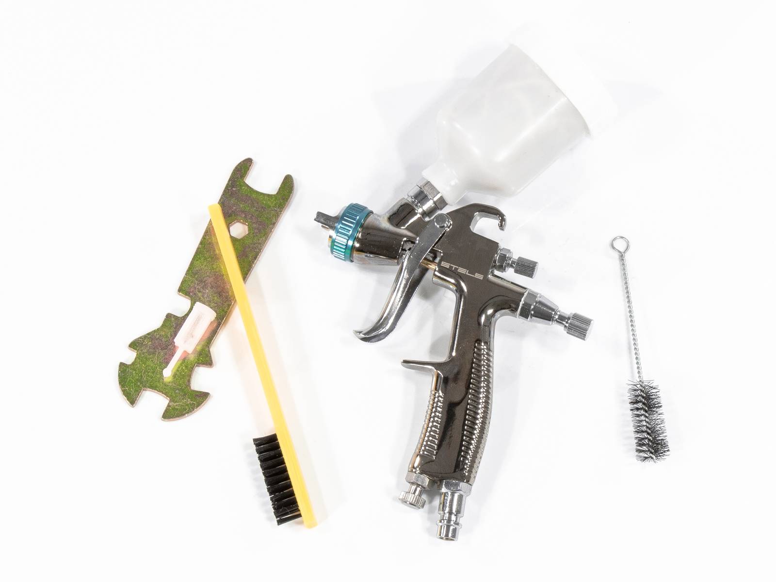 Регулятор подачи краски выведен сбоку под бачком. Дюза не только позволяет изменять размер выходного мини отверстия, но и делать факел плоским по горизонтали или вертикали, изменять угол конуса. Обычно пистолет имеет в передней части винт, регулирующий перекрытие отверстия широкой воздушной трубки капилляром с краской.