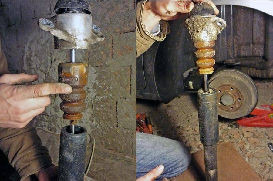 Незначительное отпотевание амортизатора в верхней его части при сохранении характеристик не является неисправностью. При осадке или разрушении резинового элемента верхней опоры телескопической стойки опору необходимо заменить.