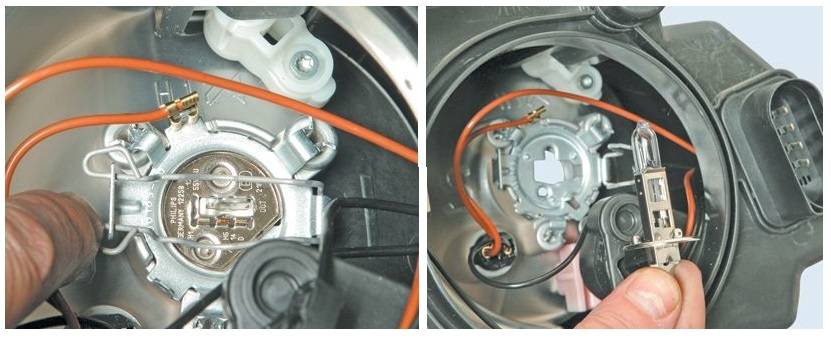 После чего извлекаем лампу H1 путем разгибания металлической пружины в стороны.
