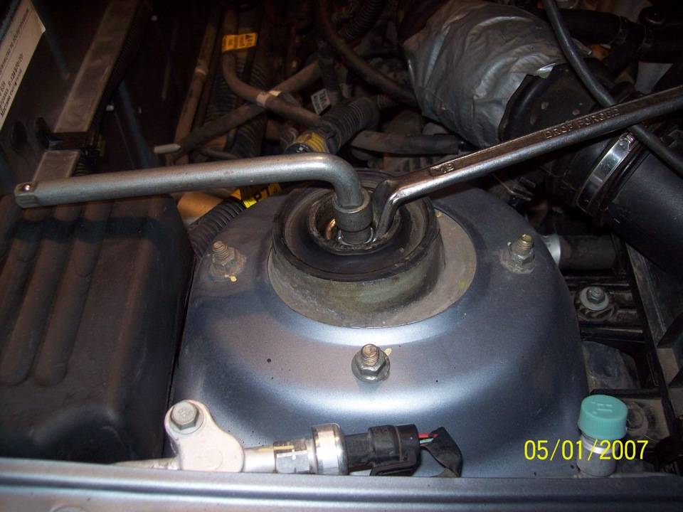 И снимаем с пружины сверху пластиковый стакан с резиновым отбойником внутри. После снимаем саму пружину. Места для снятия пружины со стойки очень мало поэтому придется малость повертеть пружину чтобы ее вытащить.Двумя газовыми ключами №2 откручиваем гайку картриджа стойки