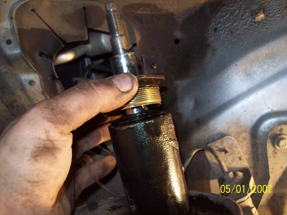 После этого откручиваем до конца гайку штока стойки в опорном подшипнике и опускаем стойку вместе с пружиной вниз так чтобы шток стойки вышел из опорного подшипника