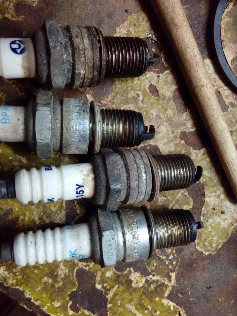 Вытушили свечу зажигания из первого цилиндра и увидели это. На фото внизу свеча зажигания, верхний 1 цилиндр снизу 4. Открутив свечу зажигания, я увидел, что она мокрая.
