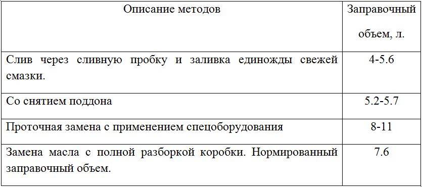Сколько потребуется свежей трансмиссионной жидкости зависит от варианта ее смены, который выберет автовладелец. Возможна как полная, так и частичная ее замена. Более детально требуемый объем масла рассмотрен в таблице ниже.