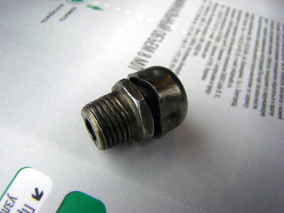 Процесс заливки масла длился около часа ввиду тонкого сечения заливной шланги. Вошло чуть больше 2-х литров. Из опыта знаю, что маловато, ввиду особенностей КПП МеМза. Было принято решение доливать еще серез сапун.Клюлем на 12,5!, подчеркиваю, 12 не налазит, 13 проворачивается…(пришлось испортить новый ключ на 12, распилив натфилем зев), выкручиваем сапун. Находится сверху КПП, со стороны рулевой рейки. Так выглядит сапун.