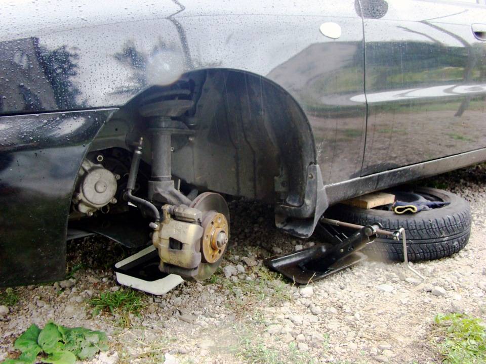 Утром в субботу проснулся, на дворе дождь… Боевой настрой менять масло пропал…, т.к. гараж то у меня есть, но яма в нем отсутсвует…, и ввиду того, что гараж, он же и склад и еще много чего…, короче, автомобиль в него заезжает чуть ли не боком, и места для ремонта нет. По-этому обслуживание всех моих нынешних и предидущих авто происходит на улице возле гаража. Однако взвесив все за и против, зарядившись пивком, все таки было принято решение менять масло.Теперь по сути: поддомкратив авто, было снято переднее левое колесо, для удобства работы подготовлено «спальнное место» (сыро, земля мокрая), подготовлена емкость для сбора отработанного масла и направляющий желоб непосредственно для его слива(далее об этом подробнее).Вот так это выглядело до
