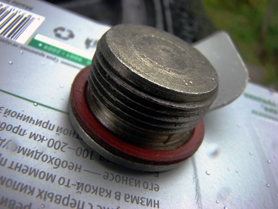 Уровень упал, откручиваем сливную пробку. На домкрате я опустил машину как можно ниже, чтобы уклон получился в сторону сливной горловины и наконец настало время пить пово!Масло стекало около 3-х часов. Я дождался пока даже капать перестало. Тем временем уничтожая пиво, в очередной раз изучал свой новый автомобиль. Наткнулся на такую деталь… В далеком 2005г. я был счастливым влалельцем автомобиля Славута, который имел такую жк КПП, как и у моего Сеньки, так вот, меняя масло в Славуте, помню, что утлотнительные колечки на пробках были медные. Спустя 8 лет МеМз обнищал…