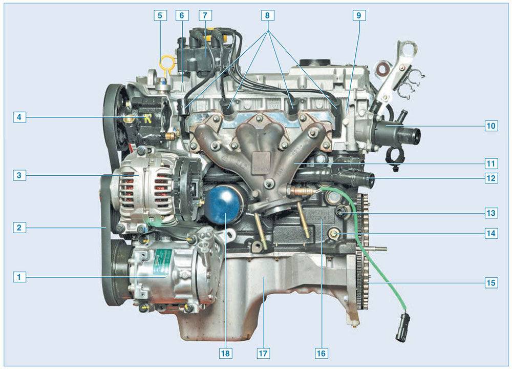 1 — компрессор кондиционера; 2 — ремень приводной; 3 — генератор; 4 — насос ГУР; 5 — масляный щуп; 6 — крышка ГБЦ; 7 — катушка зажигания; 8 — наконечники ВВ-проводов; 9 — ГБЦ; 10 — корпус термостата; 11 — выпускной коллектор; 12 — труба водяного насоса; 13 — датчик недостаточного давления масла; 14 — заглушка; 15 — маховик; 16 — блок цилиндров; 17 — поддон картера; 18 — масляный фильтр