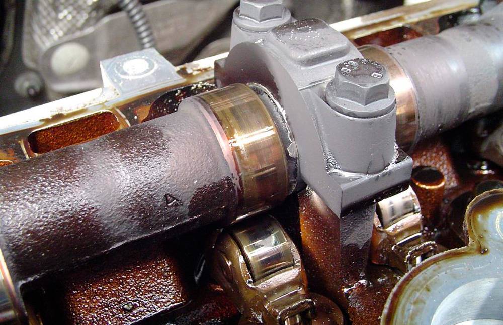 Как показано на фото выше, с двигателя автомобиля была снята клапанная крышка. Во внутренностях мотора отчетливо видно, что на распредвалах впускных и выпускных клапанов образовался густой налет. Эти сгустки – фракции распавшегося моторного масла, превратившиеся в подобие гудрона.