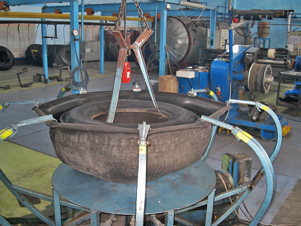 Процесс, где протекторная лента «намертво» приваривается к каркасу и «старая» шина становится «новой». Именно здесь шина приобретает качества полноценной шины. Подготовленная шина помещается в автоклав. К конверту подключаются компрессоры для откачки воздуха. В автоклаве создается давление до 6 бар, что с огромной силой придавливает протекторную ленту к каркасу. Высокая температура и давление запускают процесс вулканизации сырой резины, превращая шину в прочное монолитное изделие.