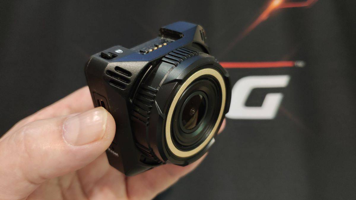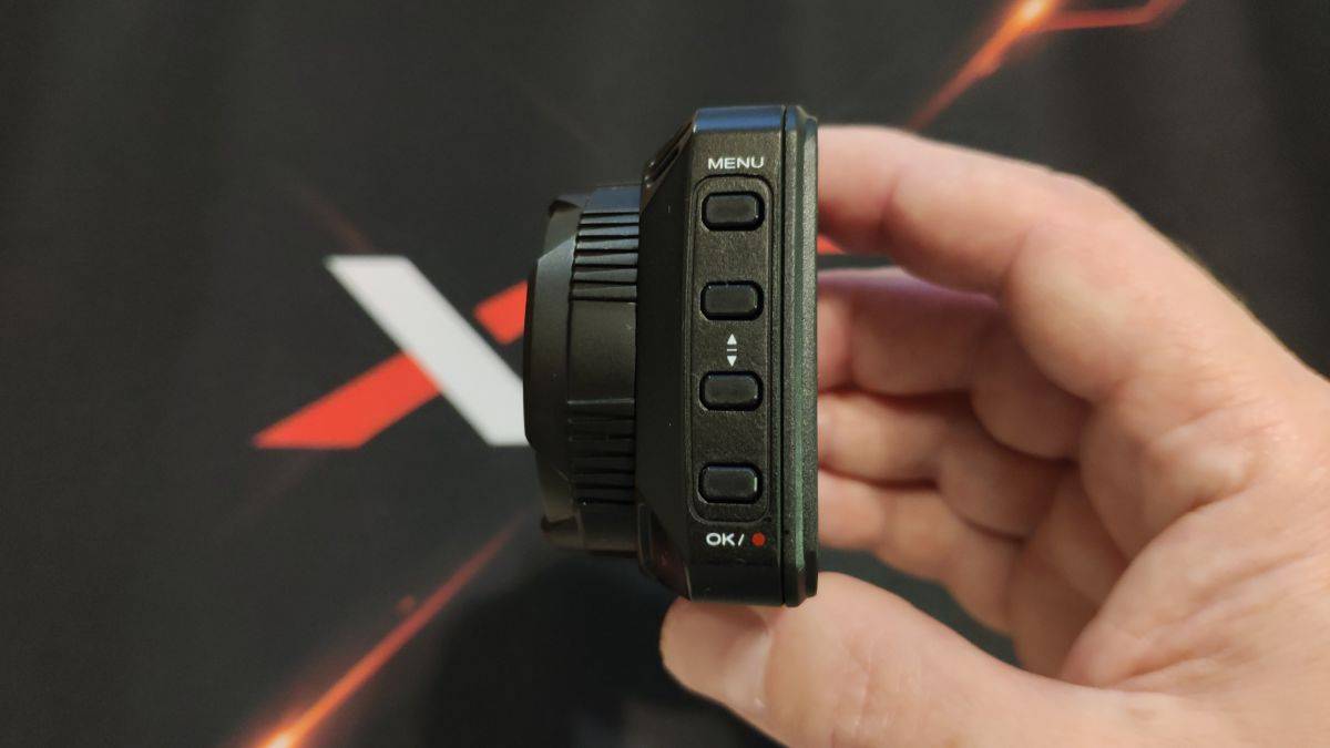 Видеорегистратор имеет очень компактный размер, практически равный спичечному коробку, что даже меньше стандартных экшн-камер. Практически, это квадратный корпус толщиной 18,5 мм и выступающий над ним на 11,5 мм объектив, стилизованный под классический фотообъектив с насечками для настройки фокуса. Большая внешняя линза с голубым просветляющим покрытием диаметром 14 мм обеспечивает широкий угол и очень качественную картинку. Но об этом позже.