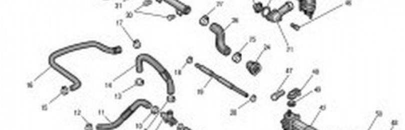 Элементы системы охлаждения: 1 — электровентилятор; 2 — кожух электровентилятора; 3, 34 — гайки; 4, 7, 9, 10, 12, 13, 15, 17, 18, 20, 25, 27, 30, 32, 36, 38, 39, 41, 43, 45 — хомуты; 5, 28, 46, 47, 50 — болты; 6 — подводящий шланг подогрева дроссельного узла; 8 — тройник; 11 — подводящий шланг отопителя; 14 — перепускной шланг; 16 — отводящий шланг отопителя; 19 — отводящий шланг подогрева дроссельного узла; 21 — корпус термостата; 22 — уплотнительное кольцо крышки термостата; 23 — термостат; 24 — патрубок водяного насоса; 26 — отводящий шланг водяного насоса; 29 — соединительный патрубок; 31 — жидкостный шланг расширительного бачка; 33 — расширительный бачок; 35 — пробка расширительного бачка; 37 — пароотводный шланг расширительного бачка; 40 — подводящий шланг радиатора; 42 — радиатор; 44 — отводящий шланг радиатора; 48 — кронштейн крепления радиатора; 49 — верхняя подушка крепления радиатора; 51 — нижняя подушка крепления радиатора