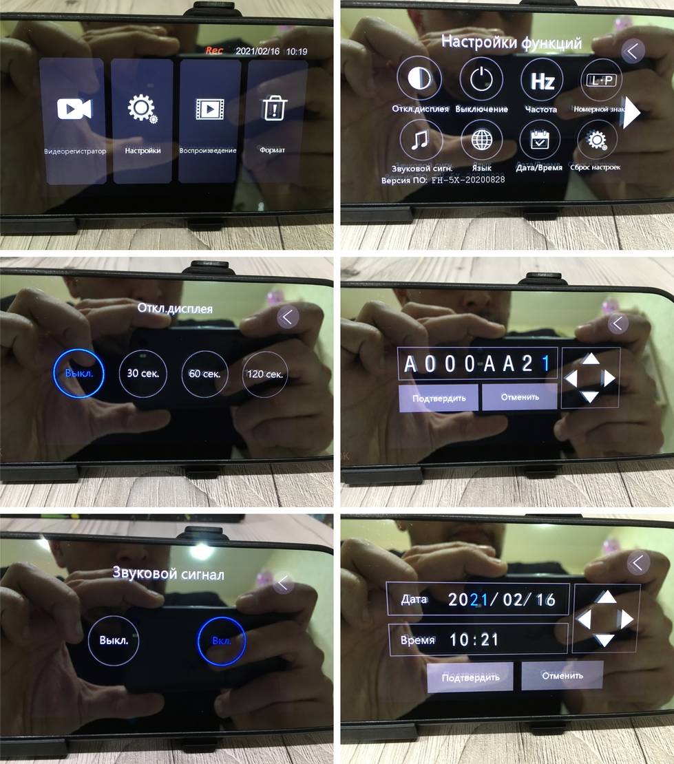 – время до отключения экрана\, номерной знак автомобиля (накладывающийся на видеозапись)\, звуковое сопровождение при нажатиях на экран\, язык меню\, дата и время: