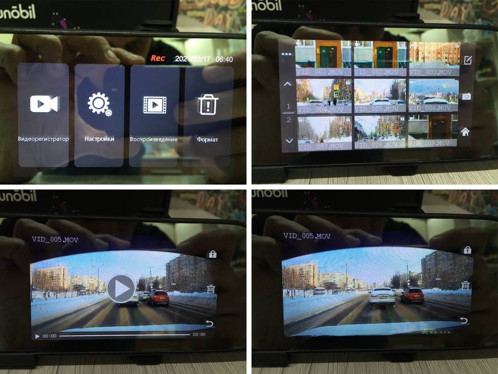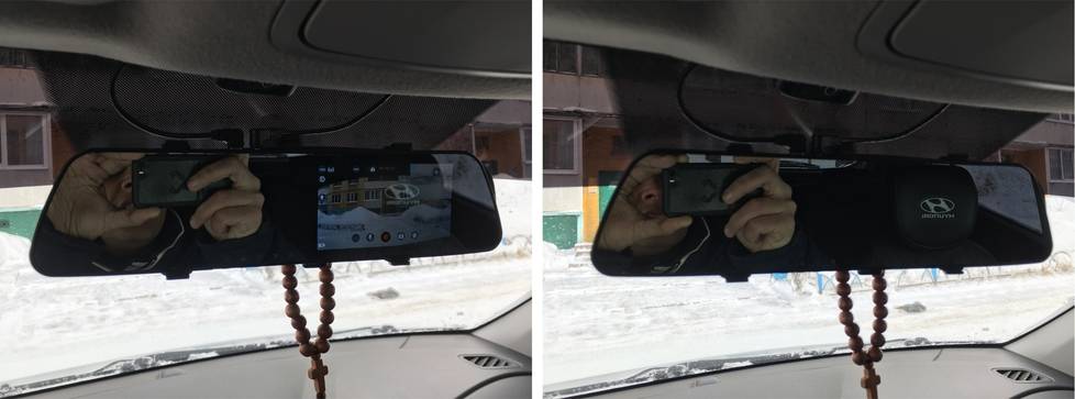 При подаче питания- регистратор автоматически включается и начинает вести запись. Также пробуждается ранее скрытый под зеркалом IPS-дисплей диагональю 4\,39\, который отключается через заданный в настройках промежуток времени\, чтобы не отвлекать водителя: