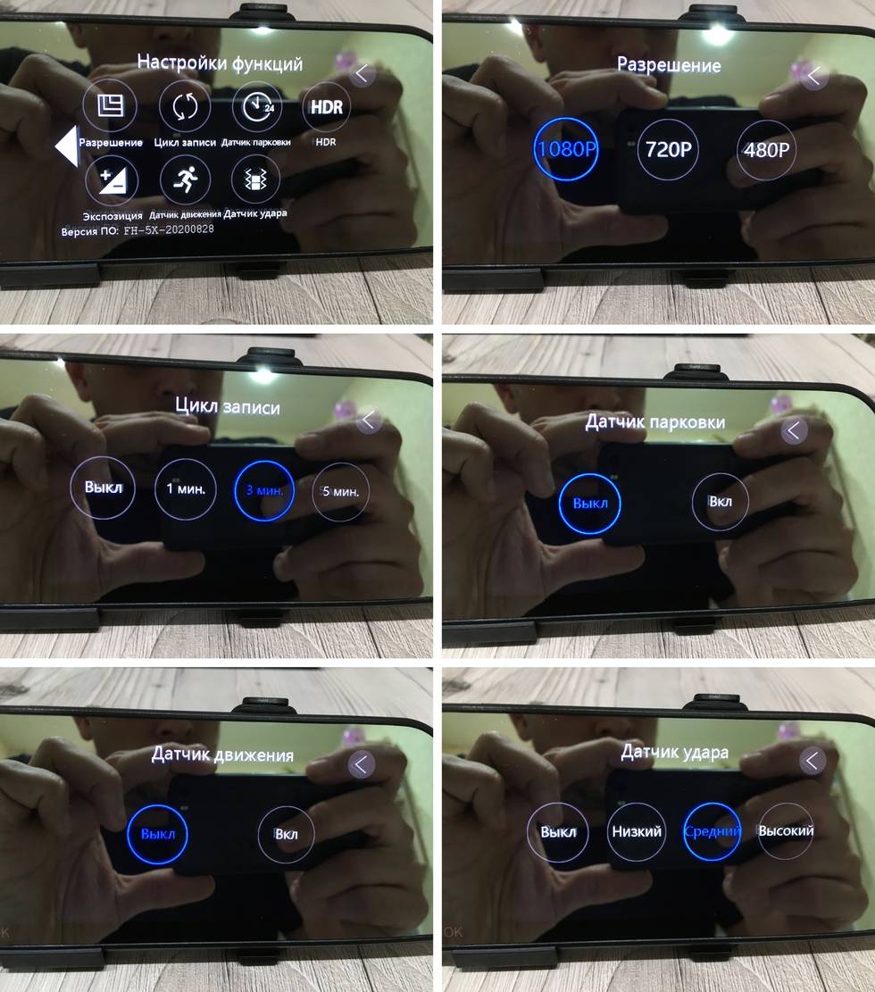 – разрешения видеозаписи\, продолжительности фрагментов цикличной записи\, включения режима парковки\, активация датчика движения и настройка чувствительности датчика удара (для записи происшествия в нестираемую папку):