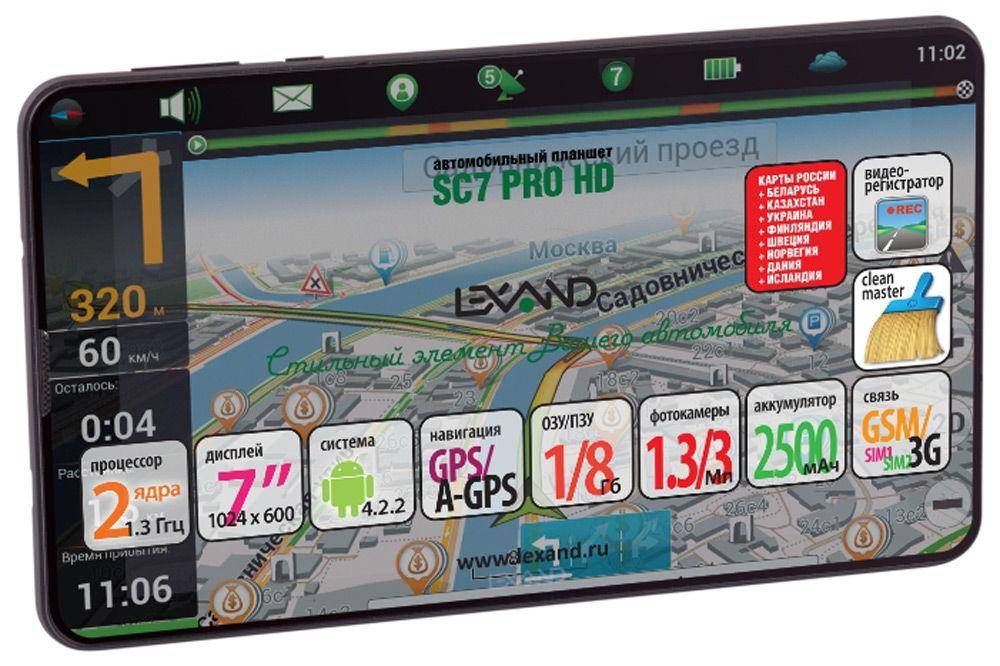 Наверняка главный компонент планшета LEXAND SC7 PRO HD — модуль GPS-навигации. Так вот, он работает практически безупречно. Сигнал спутника находит за считанные секунды, и во время движения планшет его не теряет. Точность определения местоположения также достаточно верная. Погрешности могут быть только в условиях движения в районах высотной городской застройки.