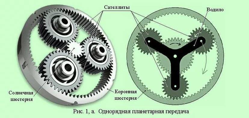 Конструкция планетарной передачи имеет набор зубчатых колёс на вращающейся оси: