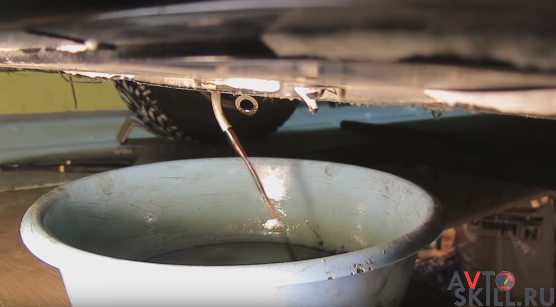 - Под сливным отверстием размещают канистру или прочую тару, иначе смена невозможна. Сливную пробку выкручивают неспешно. Вниз ставят ёмкость, потом отвинчивают деталь полностью.