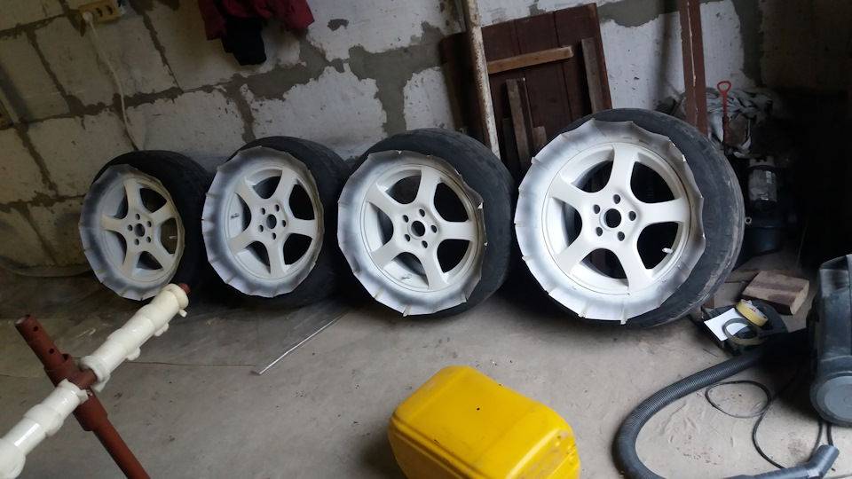 Если все-таки решено пойти ускоренным путем, то покрышки и сам автомобиль следует защитить от пыли и краски. Для этого чаще всего используют самую обычную упаковочную пленку и малярный скотч. Не стоит забывать о защите внутренней части колес – так самостоятельная окраска будет намного качественней.