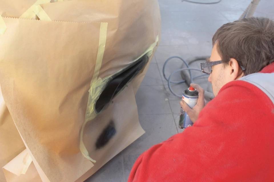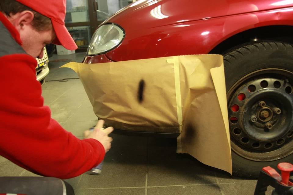 Обсудим вариант, когда сколы или царапины достаточно велики. В таком случае оклейте небольшой участок вокруг скола малярным скотчем, а неповрежденные части бампера прикройте газетой или пленкой, чтобы не напылить на них краску. Достаточно выполнить следующие действия: